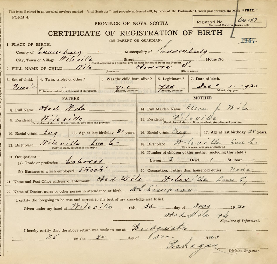 21. Name and Post Office address of Informant Obed Wile Wileville, Lunenburg Co.