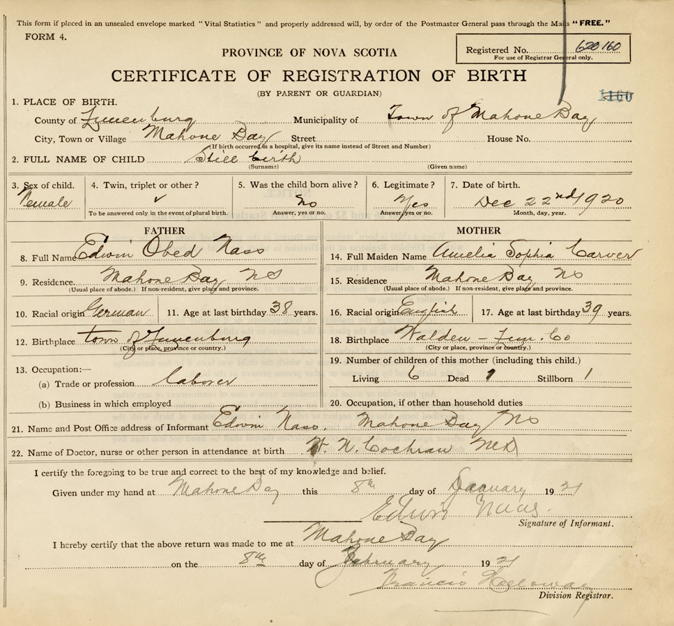 21. Name and Post Office address of Informant Edwin Nass Mahone Bay NS
