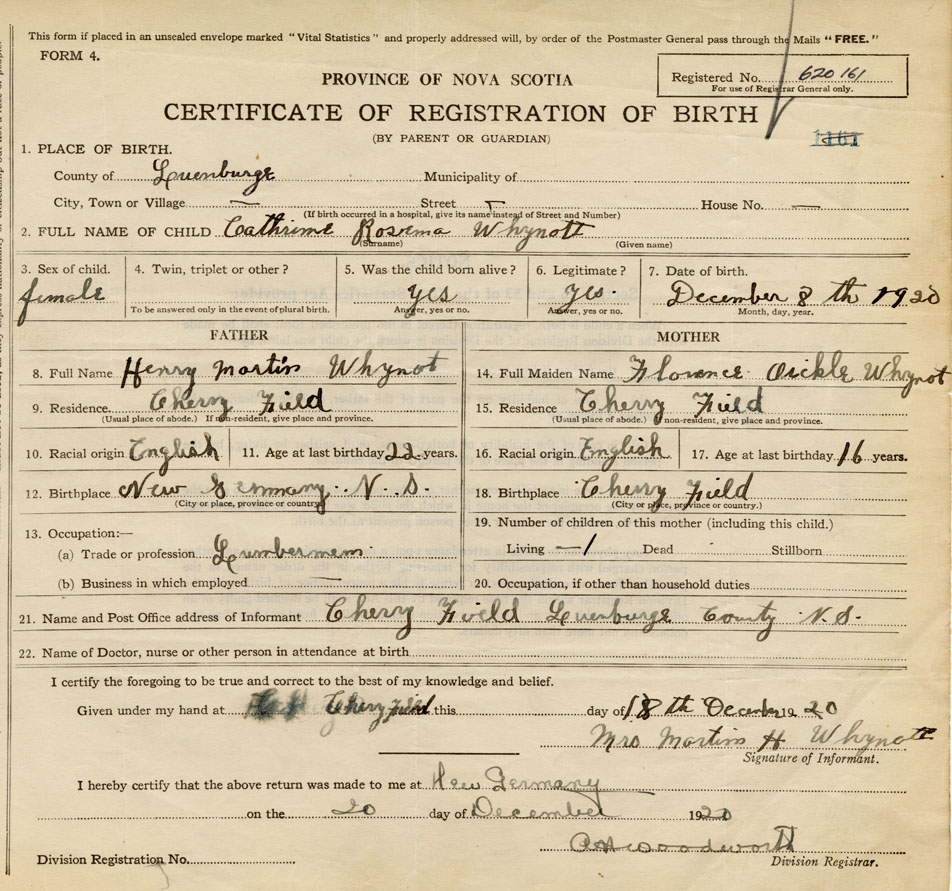 21. Name and Post Office address of Informant Mrs. Martin H. Whynott Cherry Field, Lunenburg Co