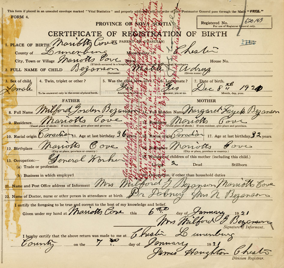 21. Name and Post Office address of Informant Mrs. Milford G. Bezanson Marriotts Cove, Lunenburg Co.
