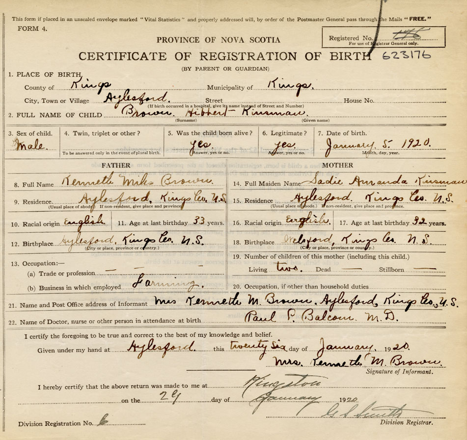 21. Name and Post Office address of Informant Mrs. Kenneth M. Brown Aylesford, Kings Co.