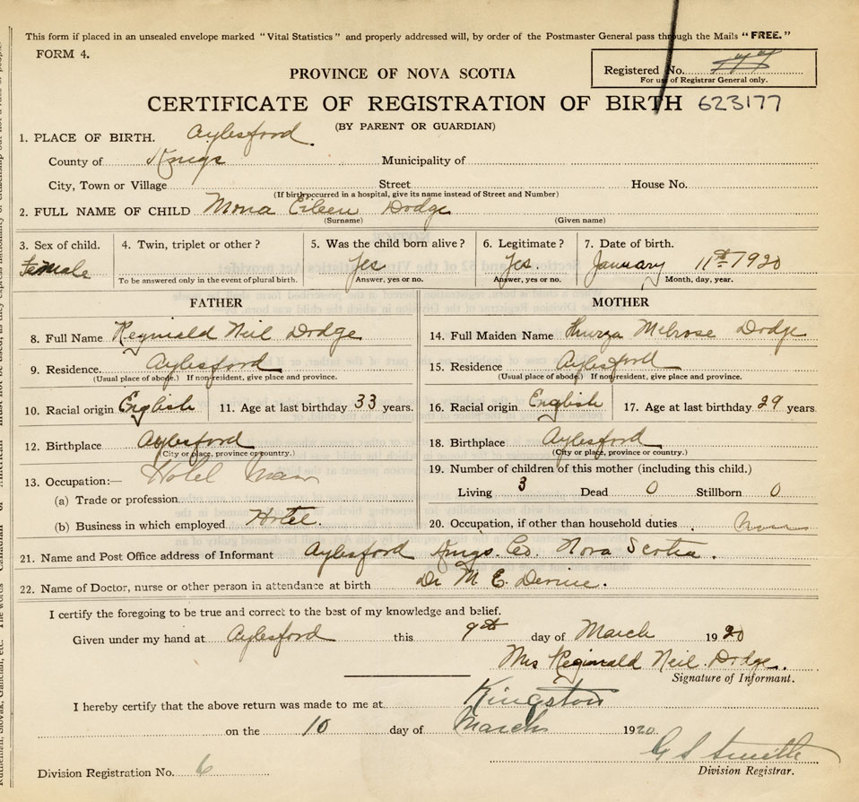 21. Name and Post Office address of Informant Mrs. Reginald Neil Dodge Aylesford, Kings Co.