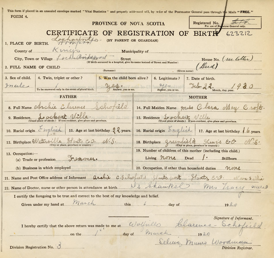 21. Name and Post Office address of Informant Archie C. Schofield Hantsport, Hants Co.