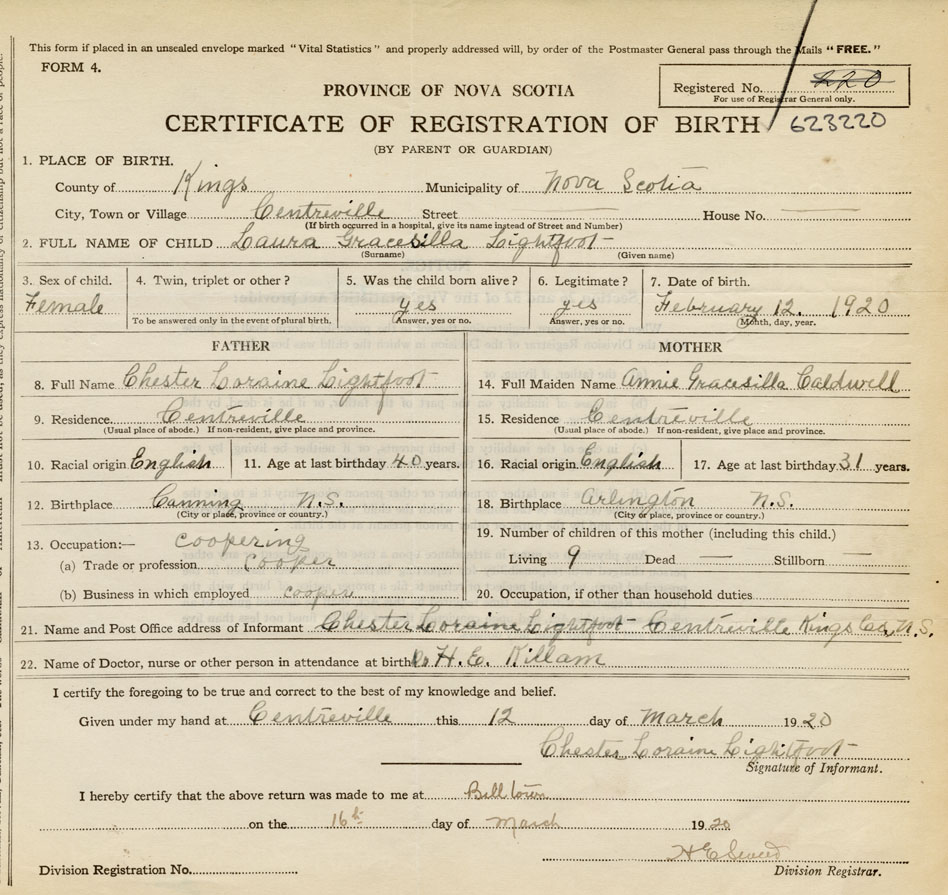 21. Name and Post Office address of Informant Chester Loraine Lightfoot Centreville, Kings Co.