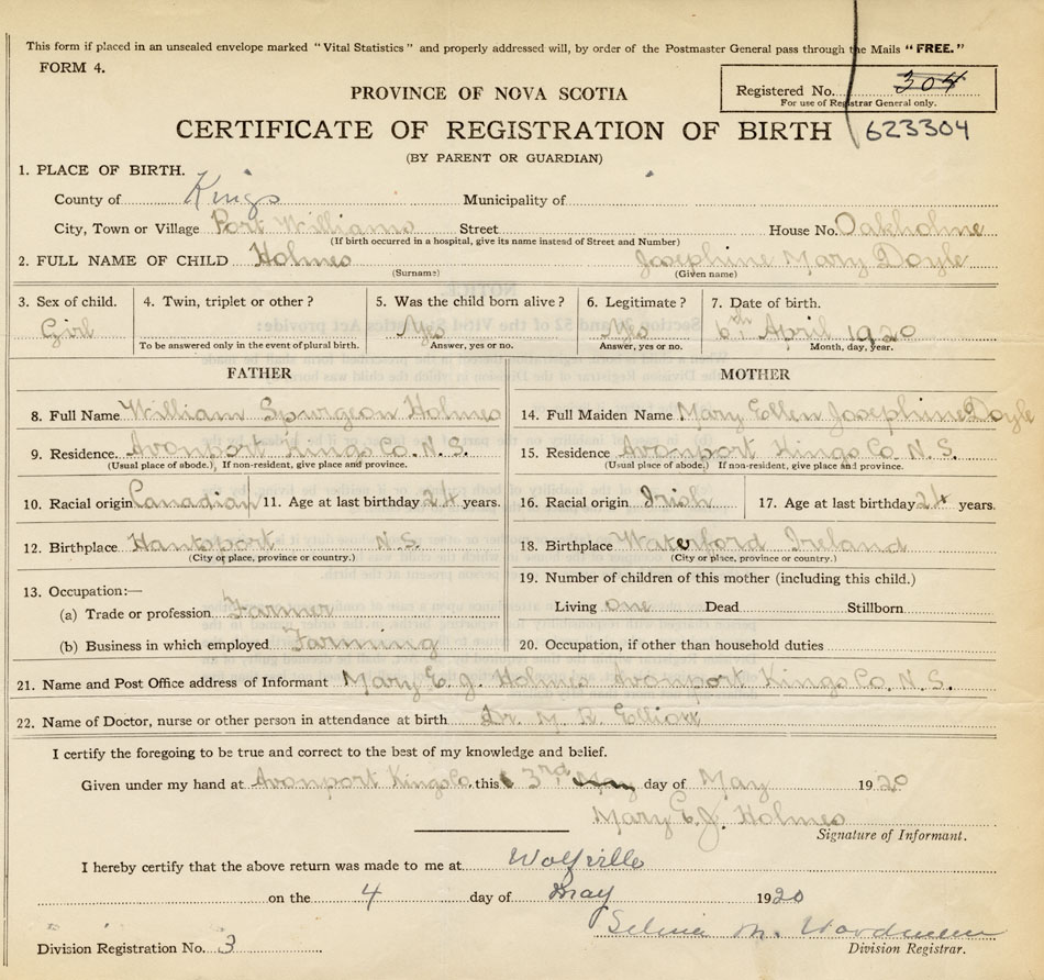 21. Name and Post Office address of Informant Mary E. J. Holmes Avonport, Kings Co.