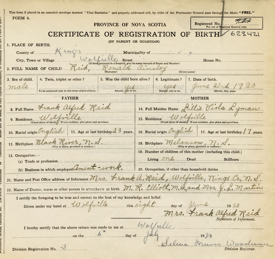 21. Name and Post Office address of Informant Mrs. Frank A. Reid Wolfville, Kings Co.