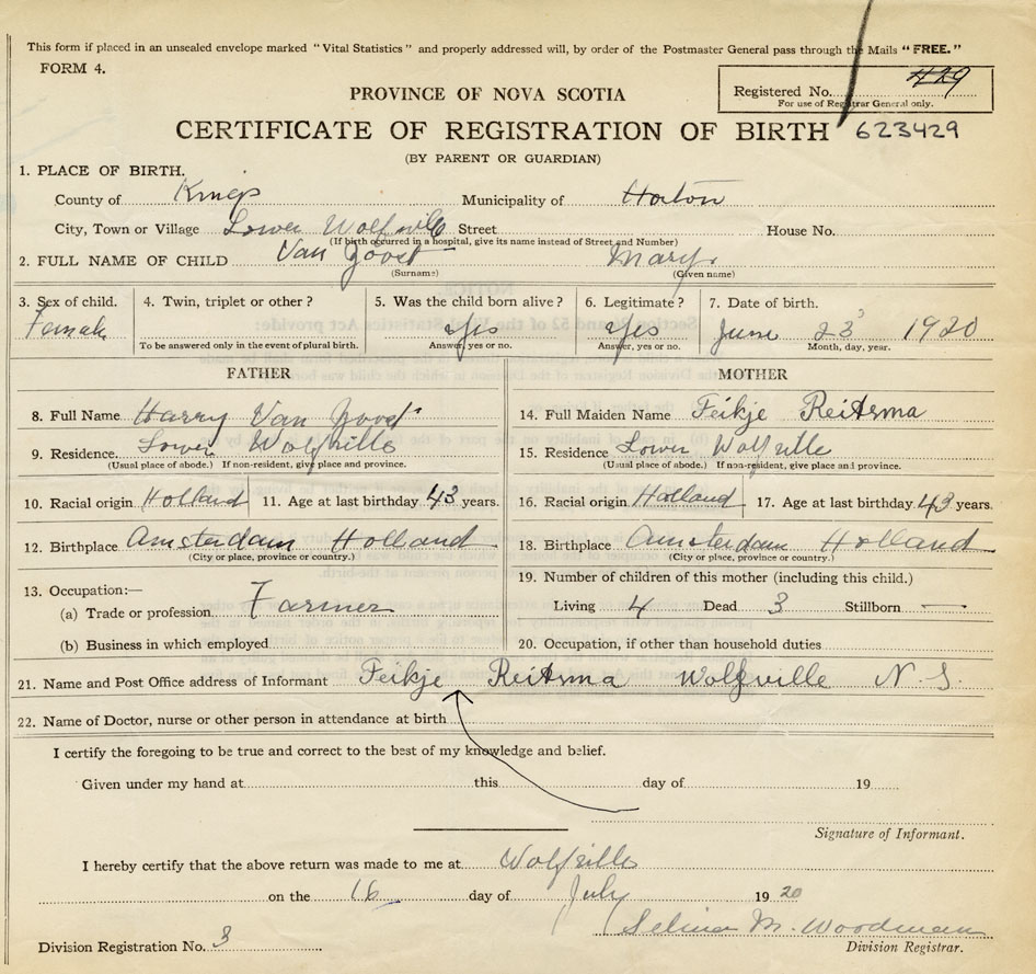 21. Name and Post Office address of Informant Feikje Reitsma Wolfville