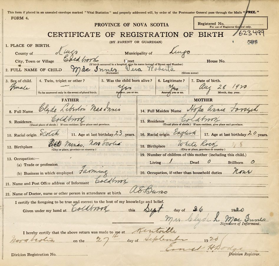 2. FULL NAME OF CHILD MacInnes, Vera Roberta