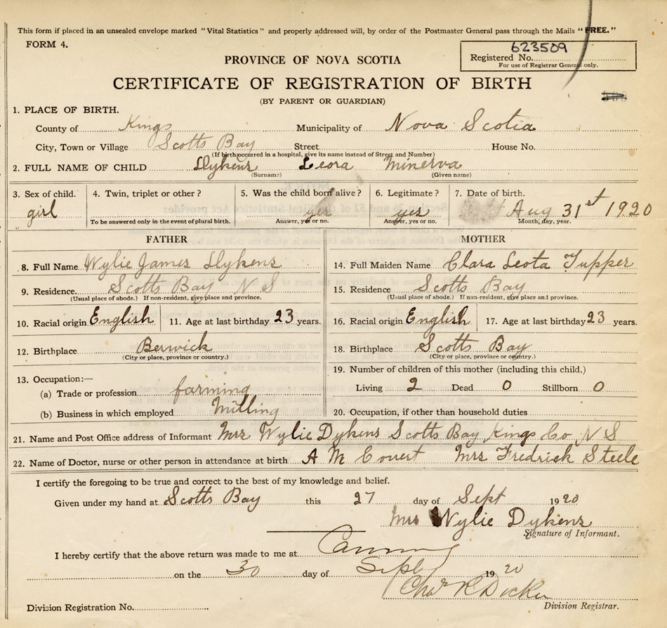 21. Name and Post Office address of Informant Mrs. Wylie Dykins Scotts Bay, Kings Co.