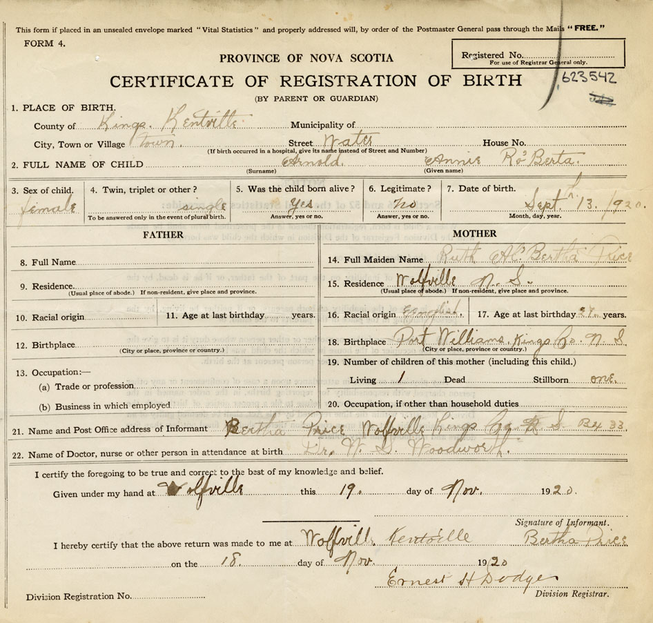 21. Name and Post Office address of Informant Bertha Price Wolfville, Kings Co. Box 33