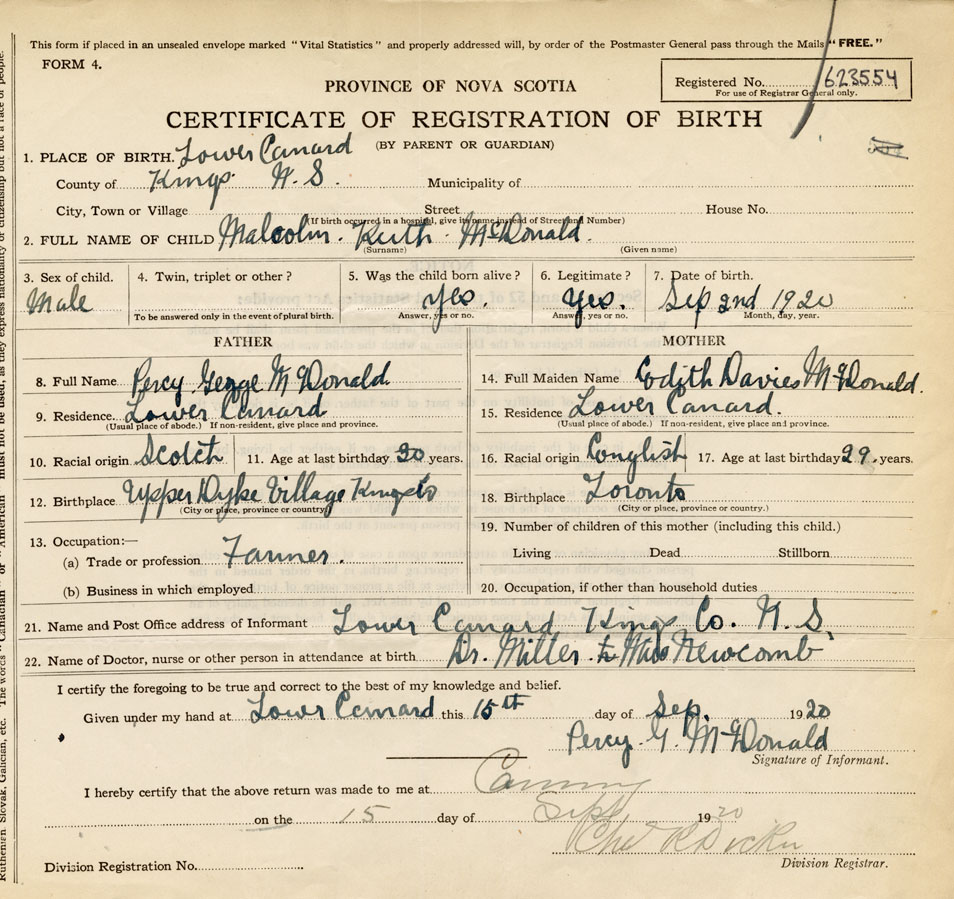 21. Name and Post Office address of Informant Percy G. McDonald Lower Canard, Kings Co.