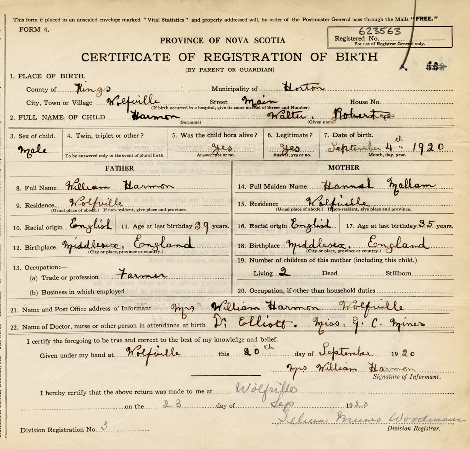 21. Name and Post Office address of Informant Mrs. William Harmon Wolfville, Kings Co.