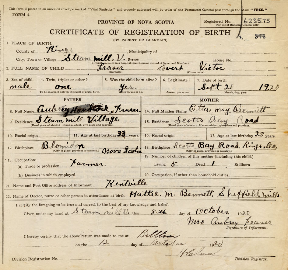 21. Name and Post Office address of Informant Mrs. Aubrey Fraser Kentville