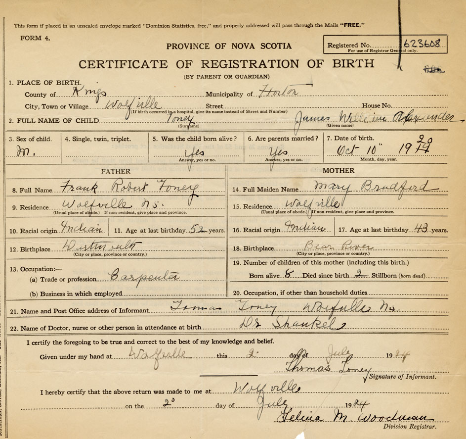 21. Name and Post Office address of Informant Thomas Toney Wolfville