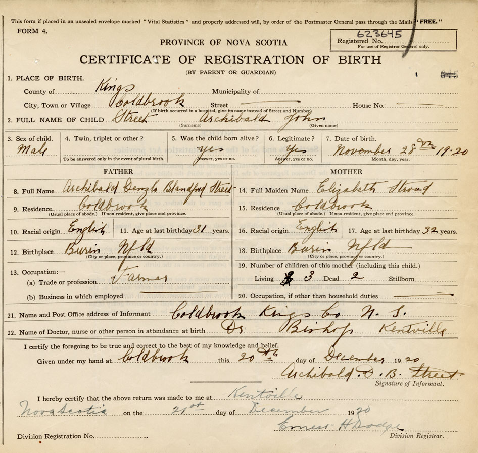 21. Name and Post Office address of Informant Archibald D. B. Street Coldbrook, Kings Co.