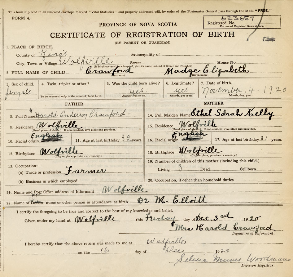 21. Name and Post Office address of Informant Mrs. Harold Crawford Wolfville