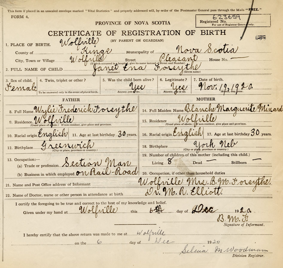 21. Name and Post Office address of Informant Mrs. B.M. Forsythe Wolfville