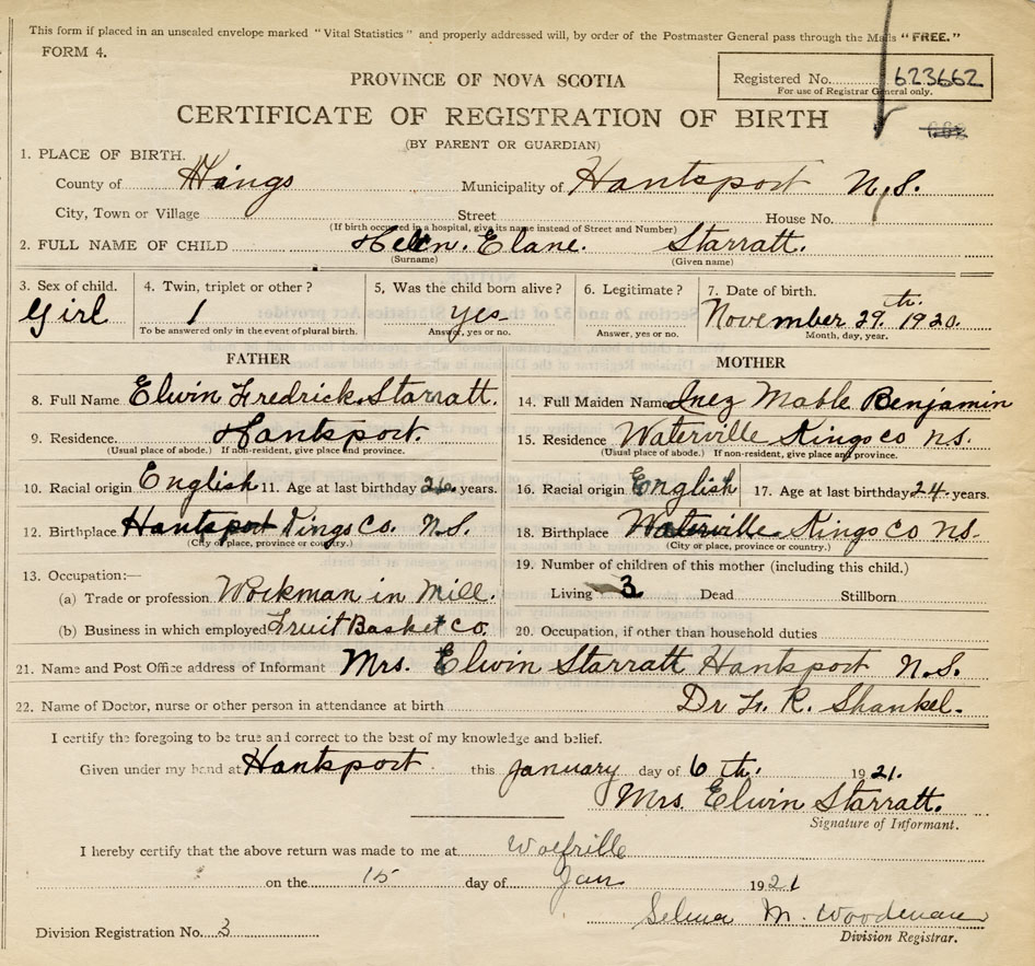 21. Name and Post Office address of Informant Mrs. Elwin Starratt Hantsport