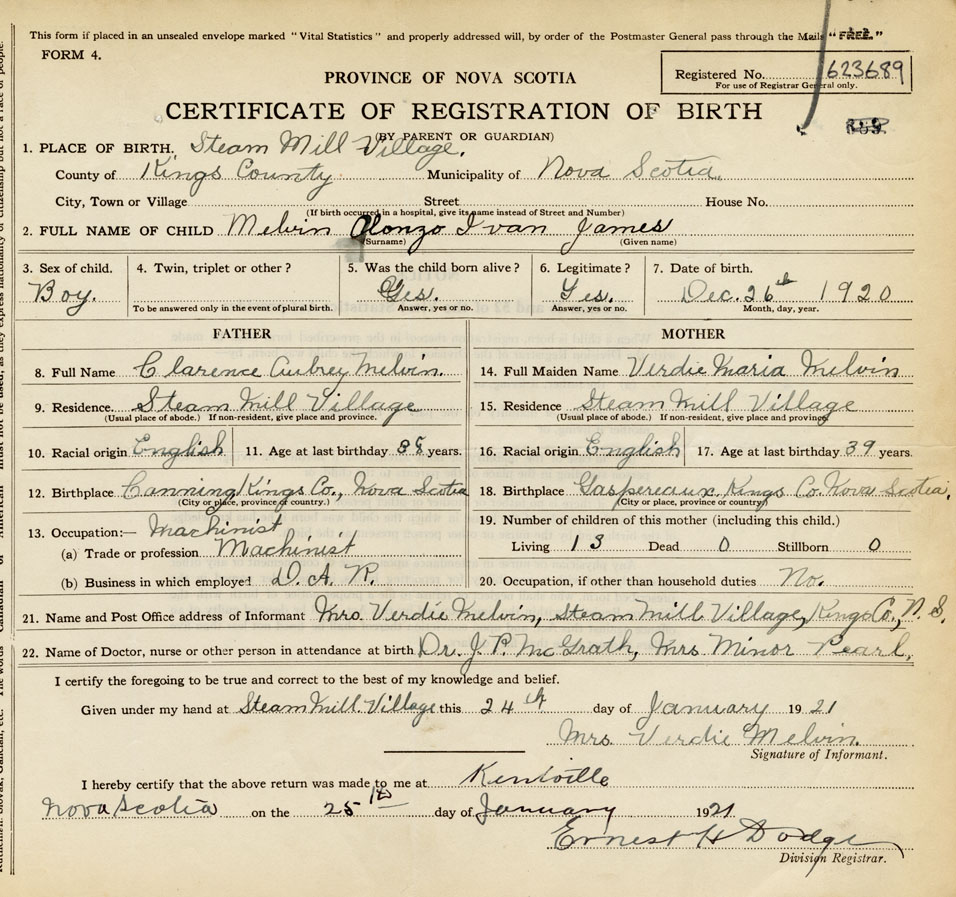 21. Name and Post Office address of Informant Mrs. Verdie Melvin Steam Mill Village, Kings Co. N.S.