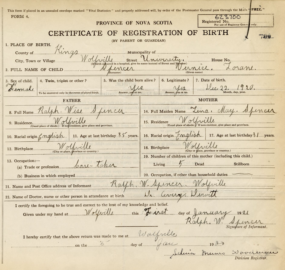 21. Name and Post Office address of Informant Ralph W. Spencer Wolfville