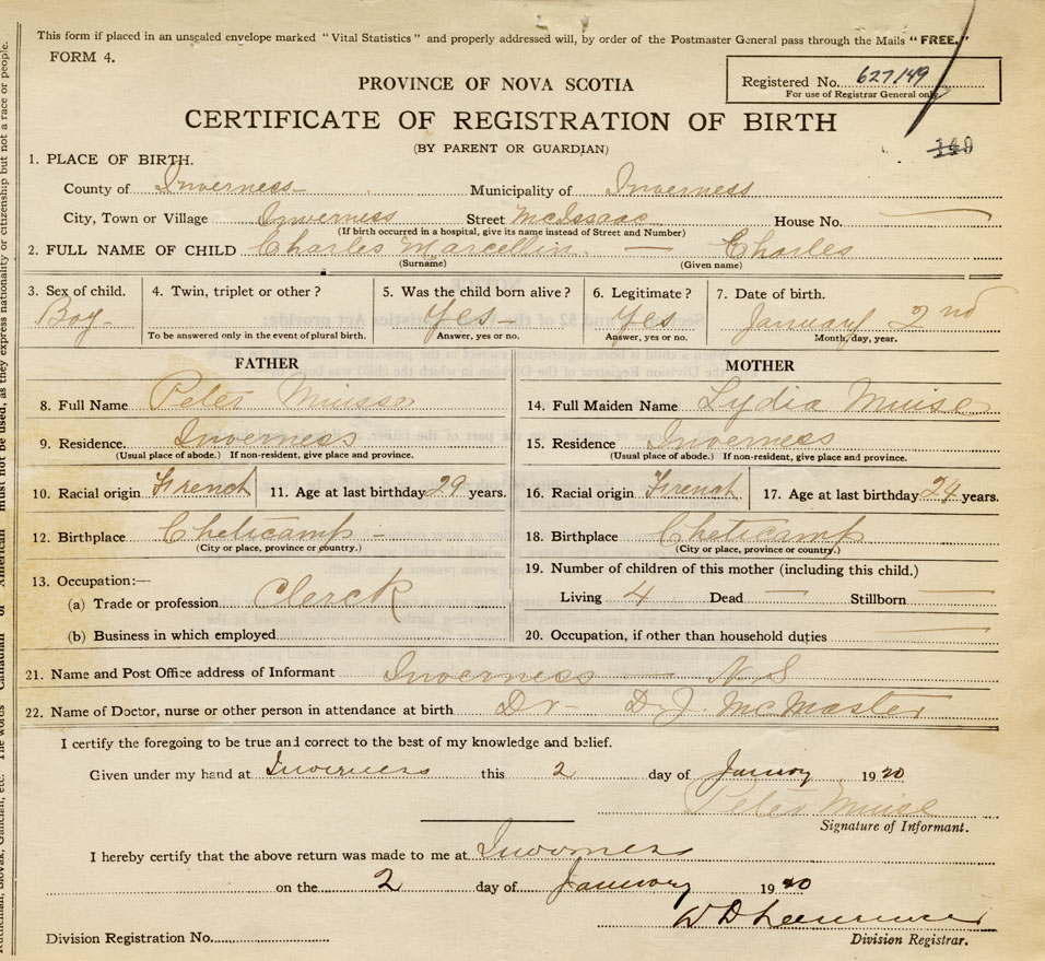 21. Name and Post Office address of Informant Peter Muise Inverness NS