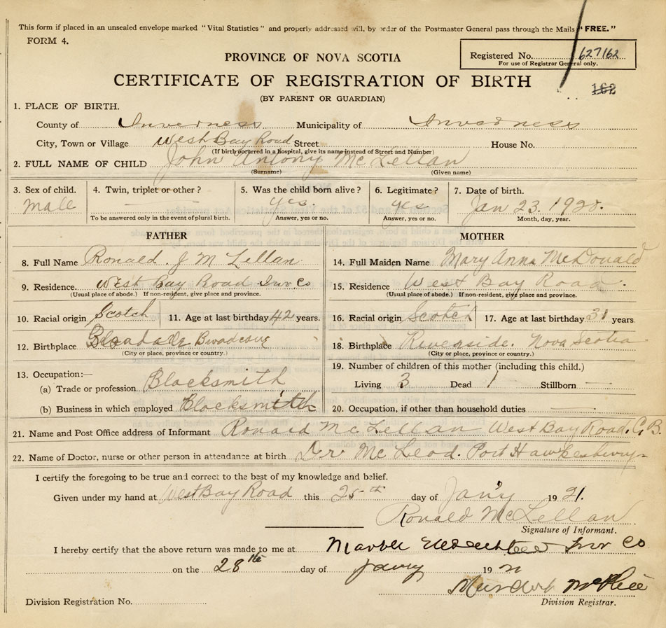 22. Name of Doctor, nurse or other person in attendance at birth Dr. McLeod, Port Hawkesbury