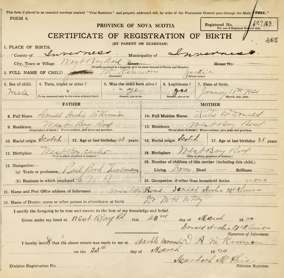 21. Name and Post Office address of Informant Donald Archie McKinnon West Bay Road, Inverness Co.