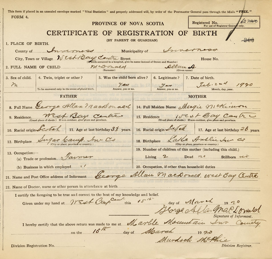 21. Name and Post Office address of Informant George Allan MacDonald West Bay Centre