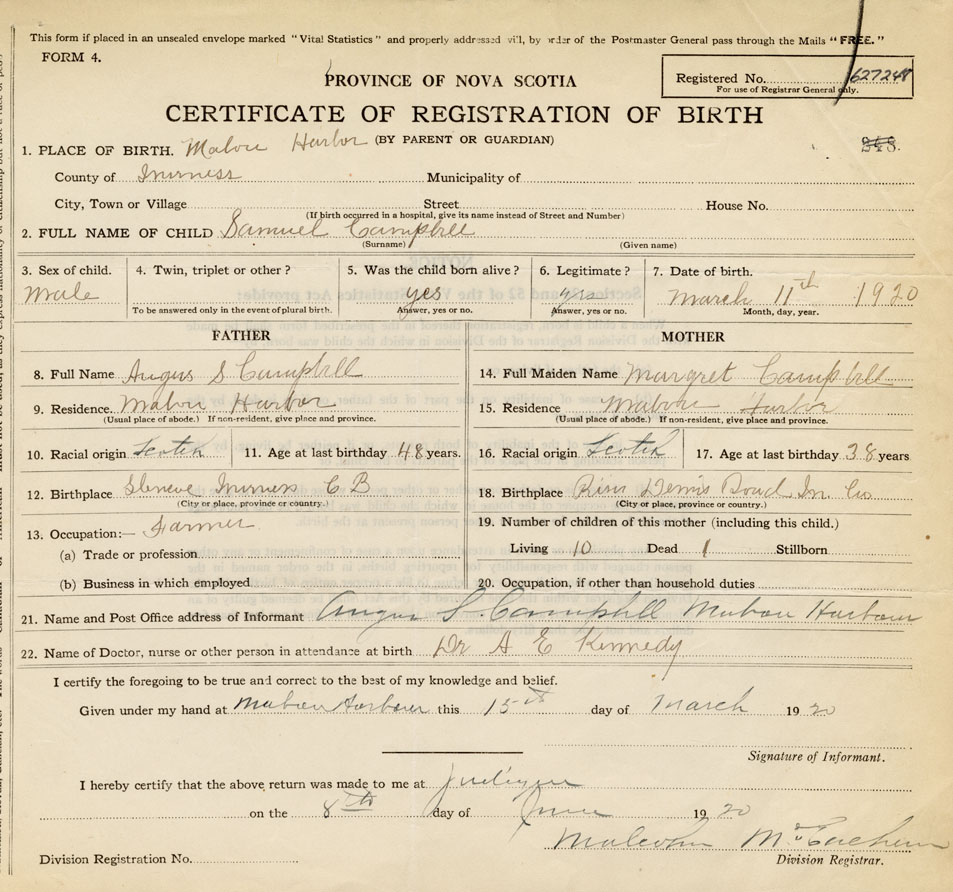 21. Name and Post Office address of Informant Angus S. Campbell Mabou Harbor