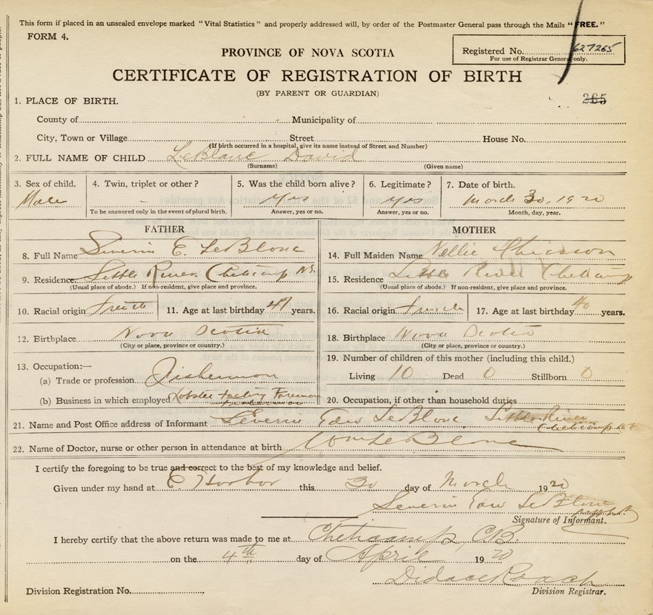 21. Name and Post Office address of Informant Severin Edward LeBlanc Little River, Cheticamp