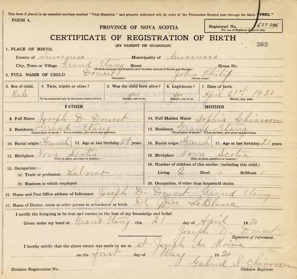 22. Name of Doctor, nurse or other person in attendance at birth Dr. Wm. LeBlanc