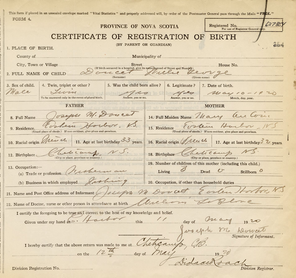 22. Name of Doctor, nurse or other person in attendance at birth William LeBlanc