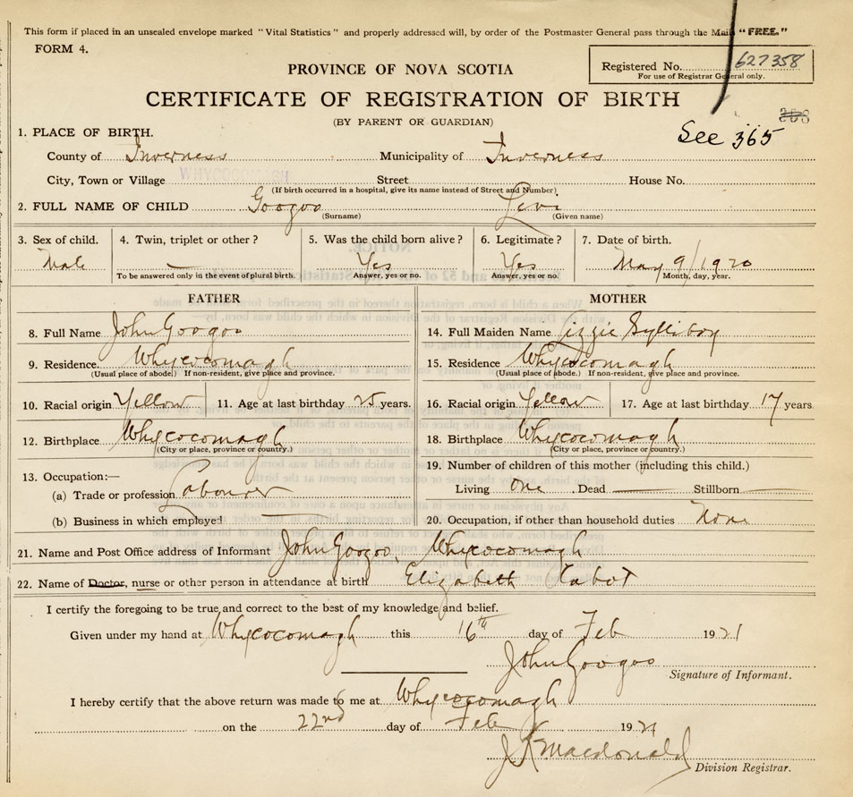21. Name and Post Office address of Informant John Googoo Whycocomagh