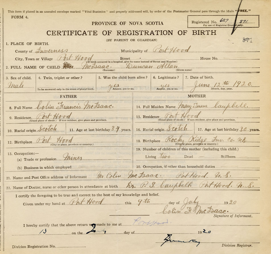 21. Name and Post Office address of Informant Mr. Colin McIsaac Port Hood