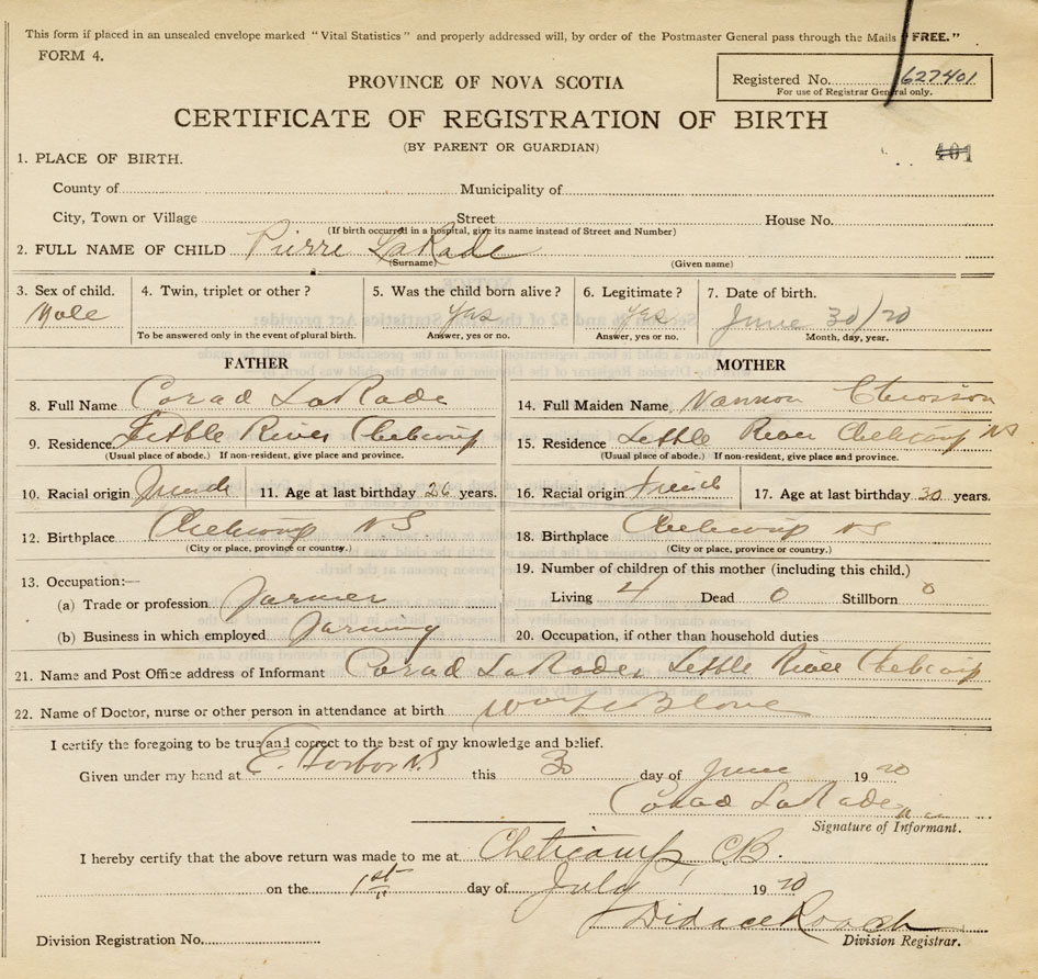 21. Name and Post Office address of Informant Conrod LaRade Little River, Cheticamp