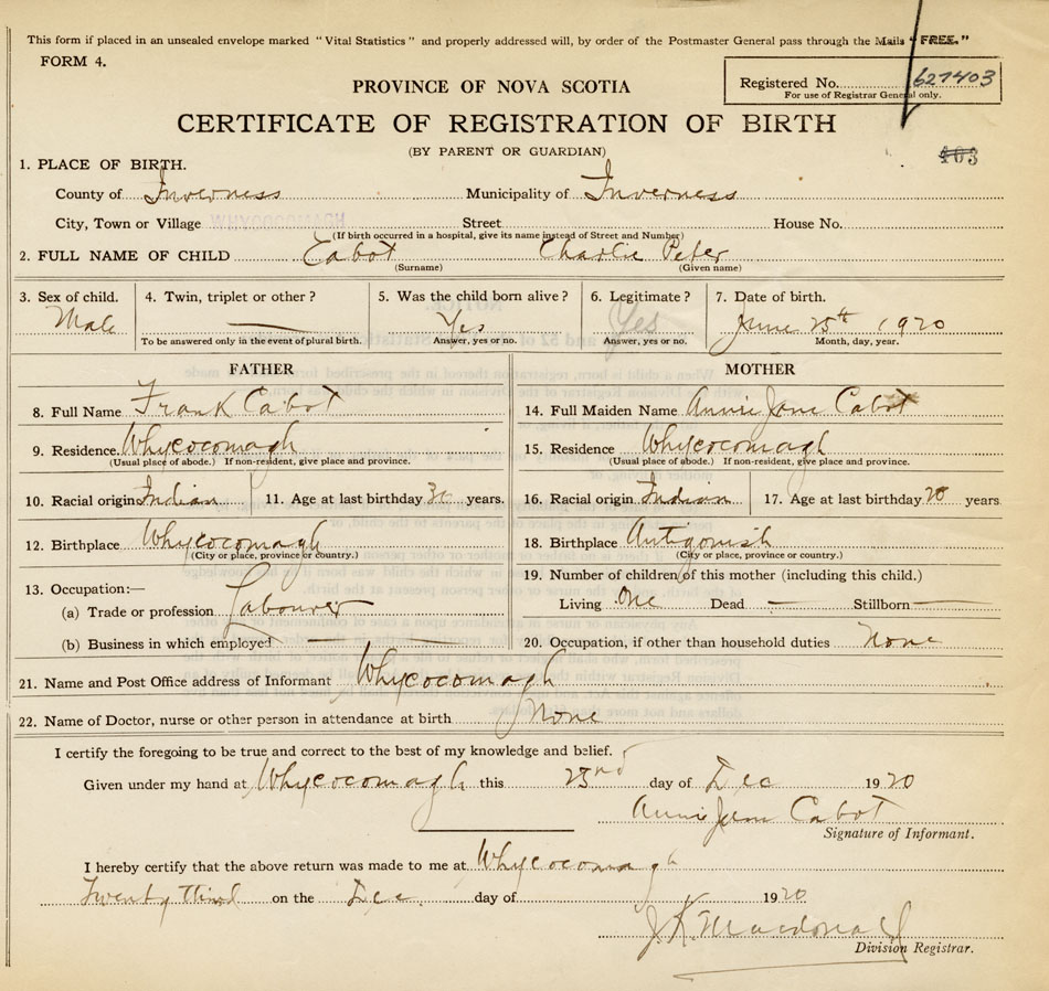 21. Name and Post Office address of Informant Annie June Cabot Whycocomagh