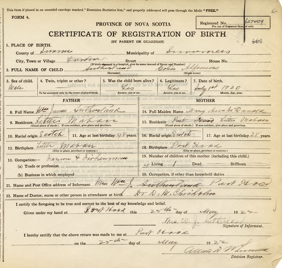 21. Name and Post Office address of Informant Mrs. W.J. Sutherland Port Hood