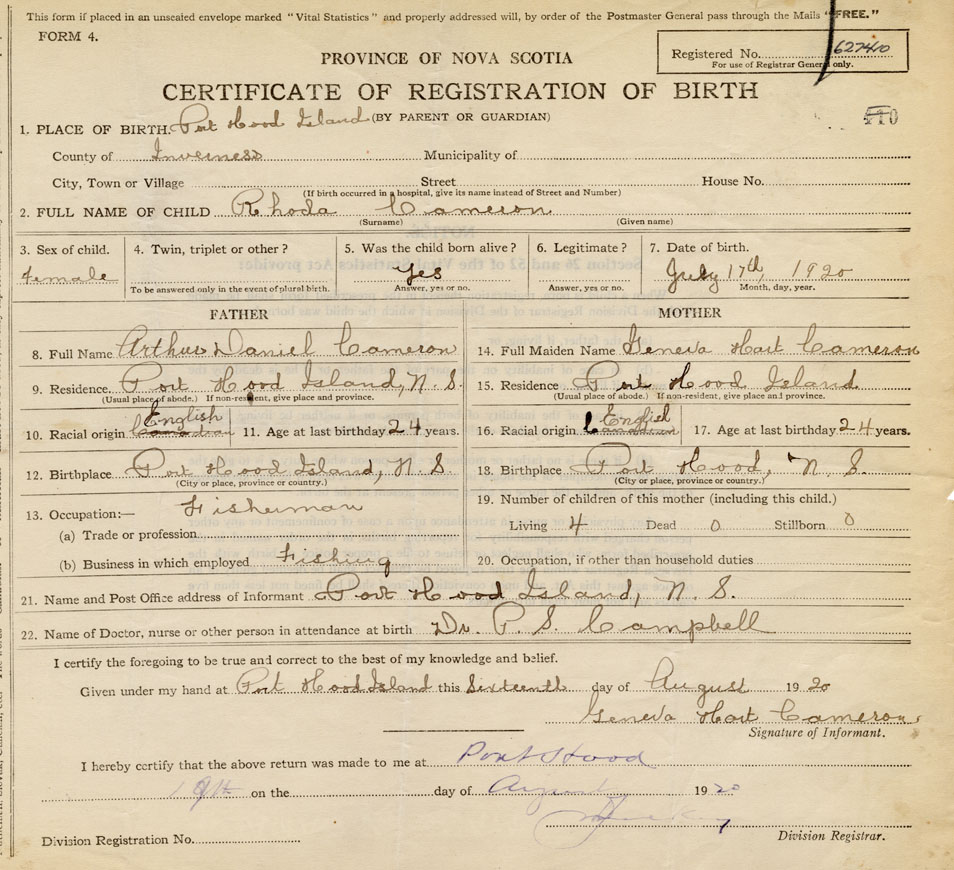 21. Name and Post Office address of Informant Geneva Hart Cameron Port Hood Island