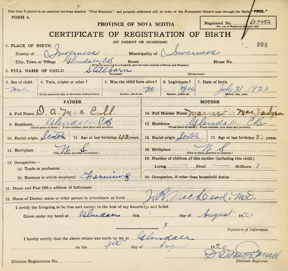 22. Name of Doctor, nurse or other person in attendance at birth J.R. MacLeod MD