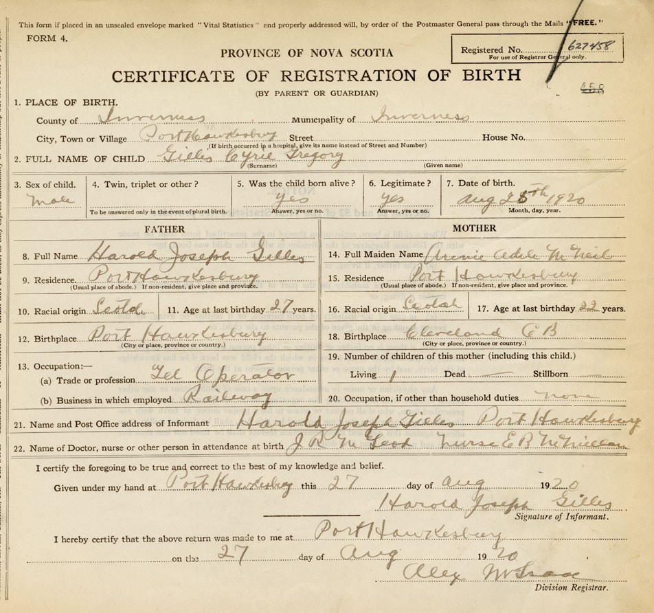 21. Name and Post Office address of Informant Harold Joseph Gillis Port Hawkesbury