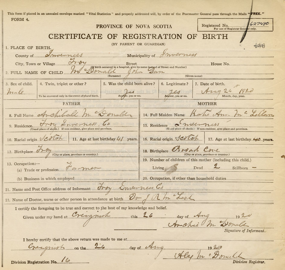 22. Name of Doctor, nurse or other person in attendance at birth Dr. J. R. McLeod