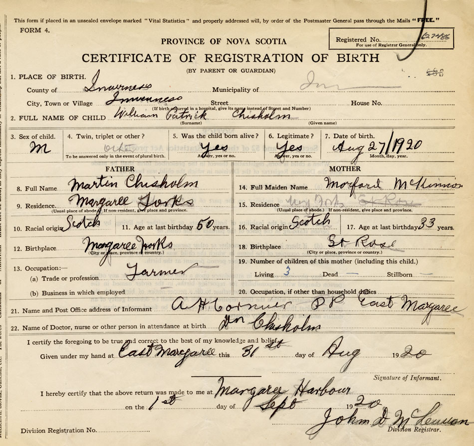 22. Name of Doctor, nurse or other person in attendance at birth Dr. Chisholm