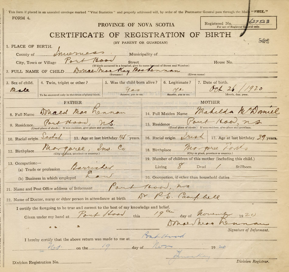 21. Name and Post Office address of Informant Donald MacLennan Port Hood