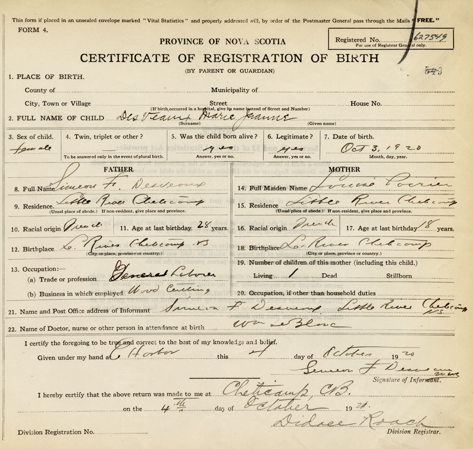 21. Name and Post Office address of Informant Simeon F. Desveaux Little River, Cheticamp