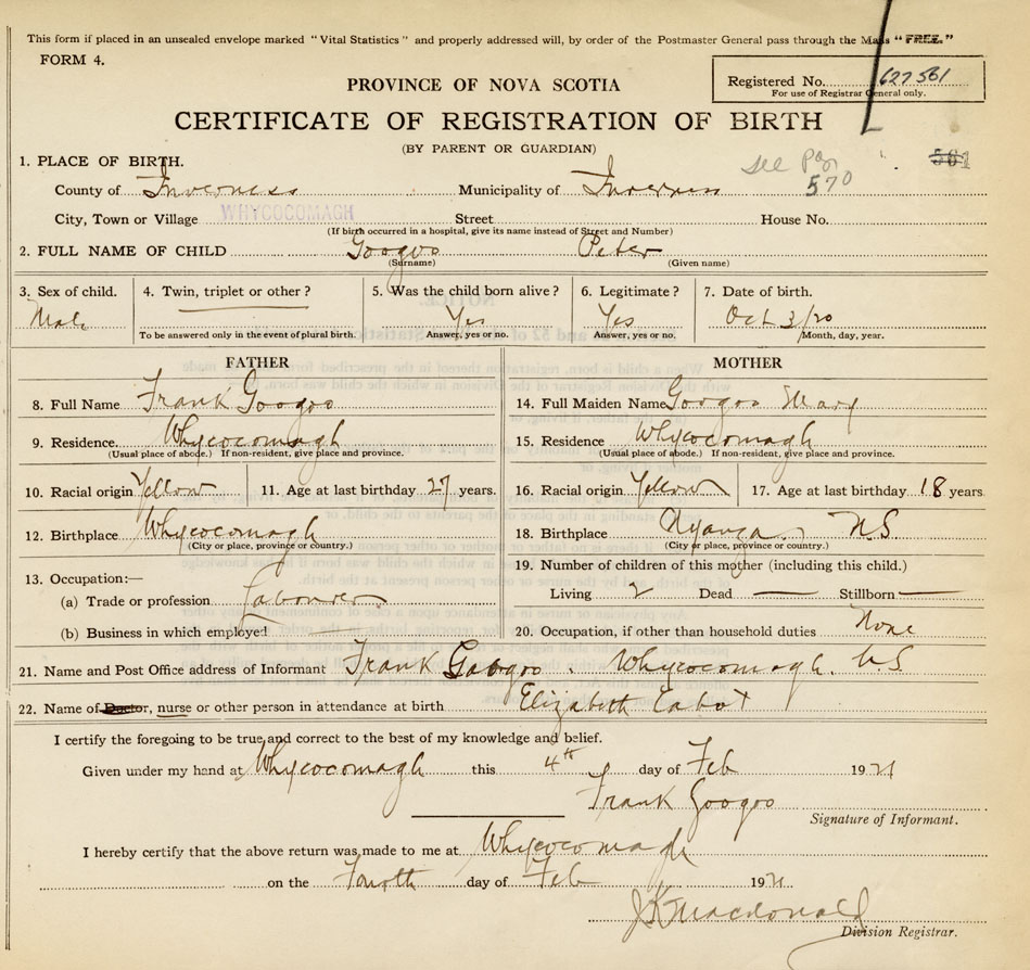 21. Name and Post Office address of Informant Frank Googoo Whycocomagh