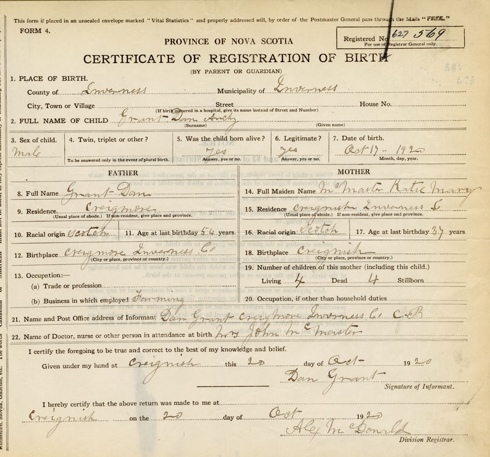 21. Name and Post Office address of Informant Dan Grant Creigmore, Inverness Co.