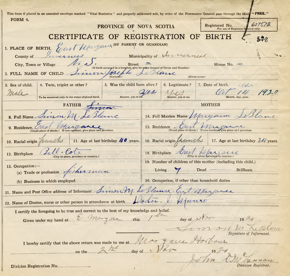 21. Name and Post Office address of Informant Simon M. LeBlanc East Margaree