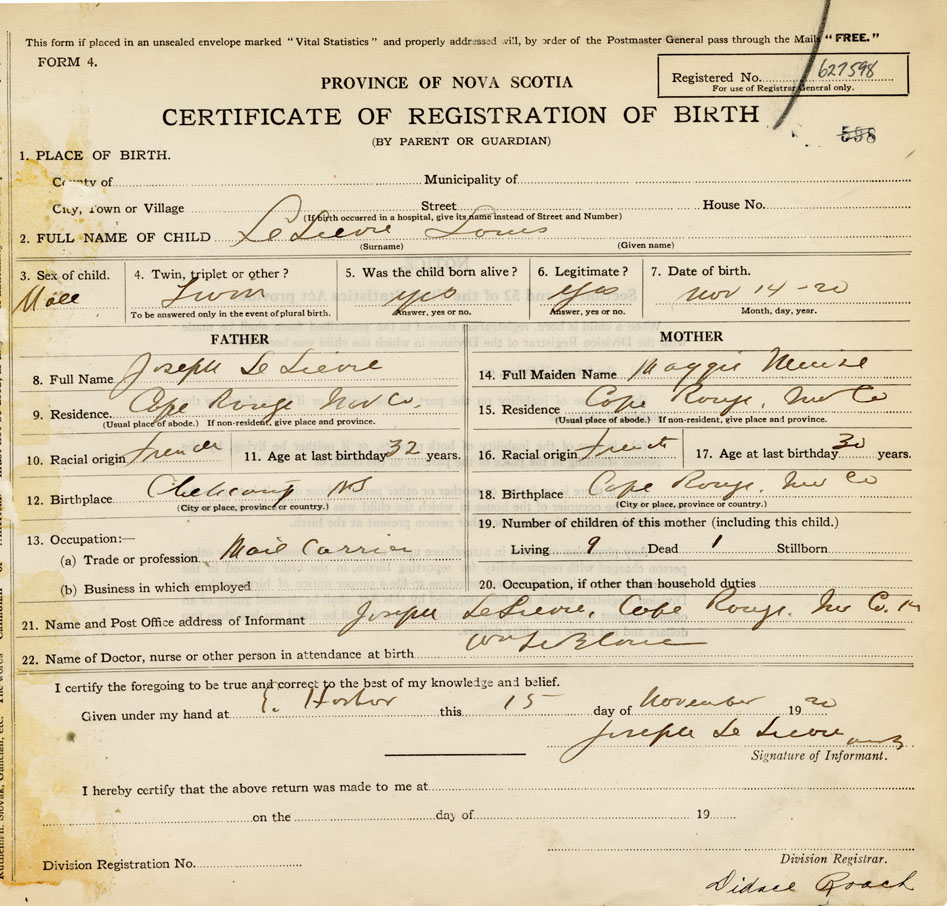 22. Name of Doctor, nurse or other person in attendance at birth Wm. LeBlanc
