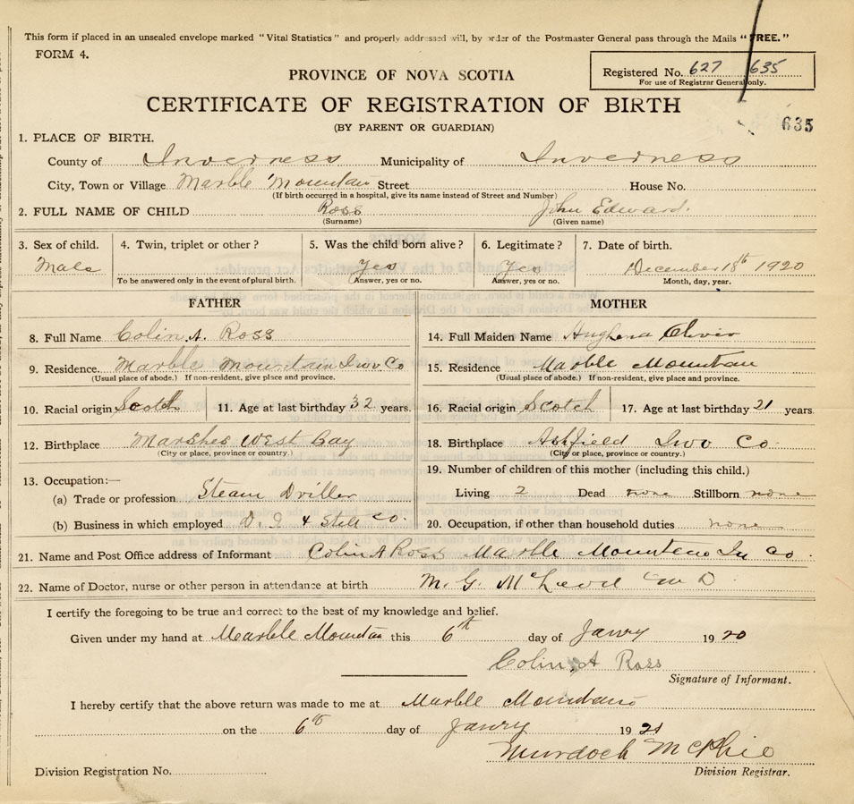 21. Name and Post Office address of Informant Colin A. Ross Marble Mountain, Inverness Co.