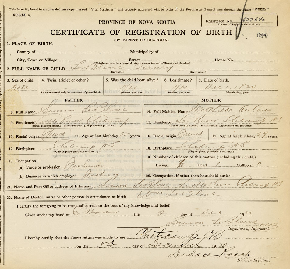 21. Name and Post Office address of Informant Simon LeBlanc Little River, Cheticamp
